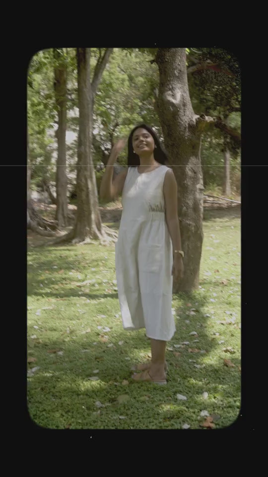 The Venkatagiri Jamdani one piece dress is a celebration of art . Drafted with round neckline and hand-embroidered details on the waistline, pockets added for utmost comfort.